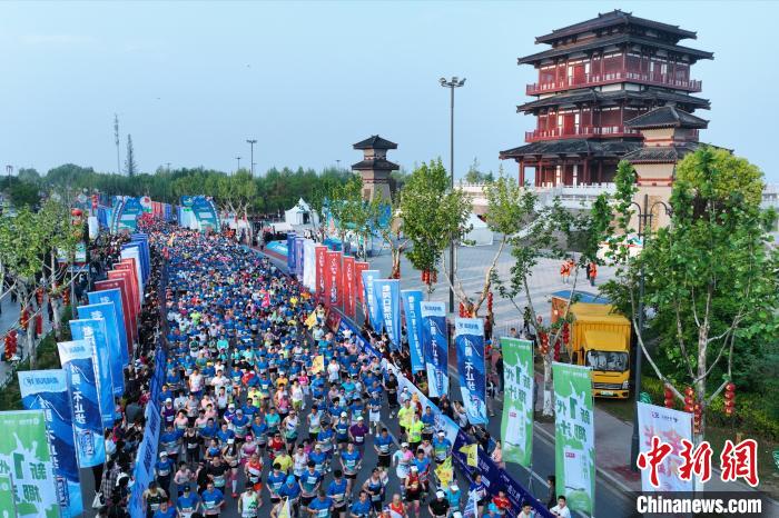湖北老河口4月20日电 (张倩龙 李雯艳 张子纬)2025老河口半程马拉松20日在湖北省老河口市沿江大道(翔鹤楼)鸣枪开跑,7000名跑者沿江穿城,感受城市之美。