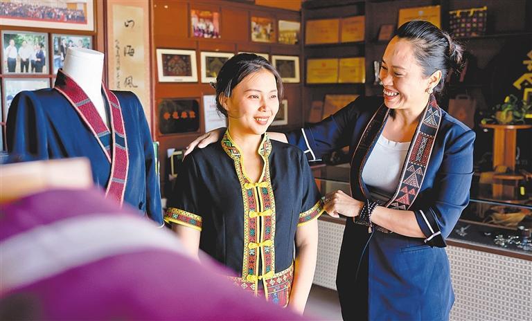 11月28日,海南黎之韵文化传播有限公司设计师唐丽金(右)在介绍黎锦服装。她将黎锦传统工艺与现代时尚元素巧妙融合,推出了一系列黎族特色时装作品。