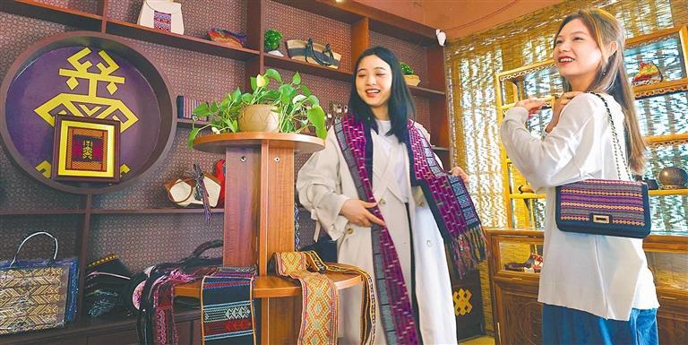 11月28日,海南昌江县黎之韵展销馆,游客在选购黎锦文创产品。