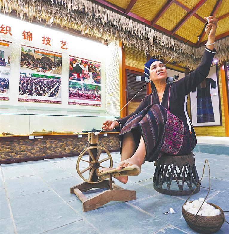 11月27日,东方市黎锦传习所,织娘脚踩纺车,将手中棉花纺成棉线。