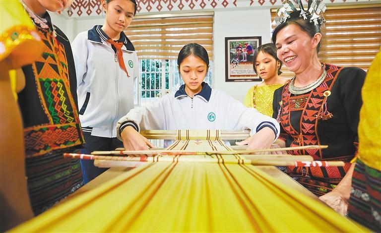 11月28日,海南昌江思源实验学校,学生在实验课上学习黎锦技艺。从2012年起,黎锦技艺作为一门课程走进海南各地中小学校。