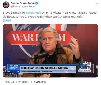 美媒報道指出,自馬斯克等人為H-1B簽證辯護,引發MAGA忠誠支持者的強烈批評後,班農幾乎沒有停止過對馬斯克的抨擊,今天大罵移民是對西方文明的威脅,而“科技巨頭寡頭”卻支持H-1B簽證項目,明天就怒噴H-1B簽證是巨大“騙局”。