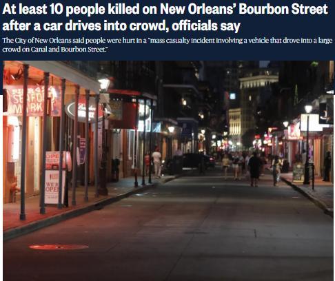 据报道,新奥尔良市在其官方网站上发布的声明,证实了这一伤亡数字。声明称,“法国区运河街和波旁街附近,一辆汽车冲撞人群,造成大规模伤亡事件”。