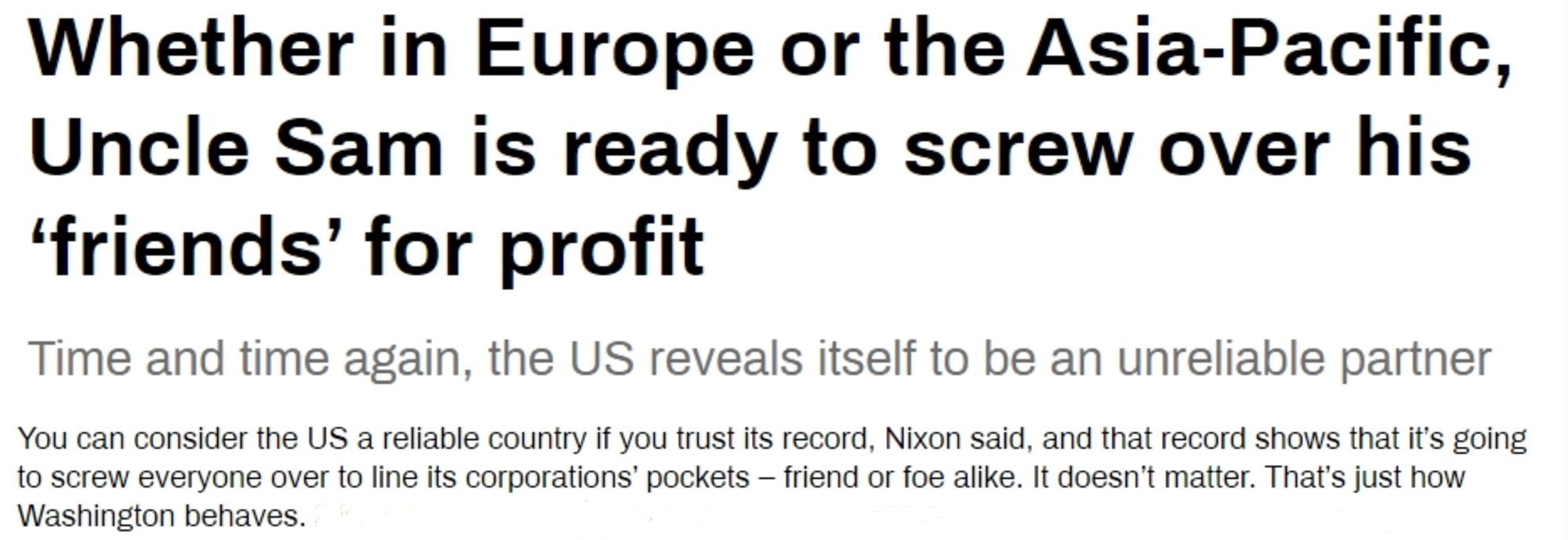 正如美国电台主持人、政治分析家加兰・尼克松在一篇文章中所说,历史记录表明,“美国为了本国公司的利益会坑害所有人――无论朋友还是敌人。这就是华盛顿的行为方式”。