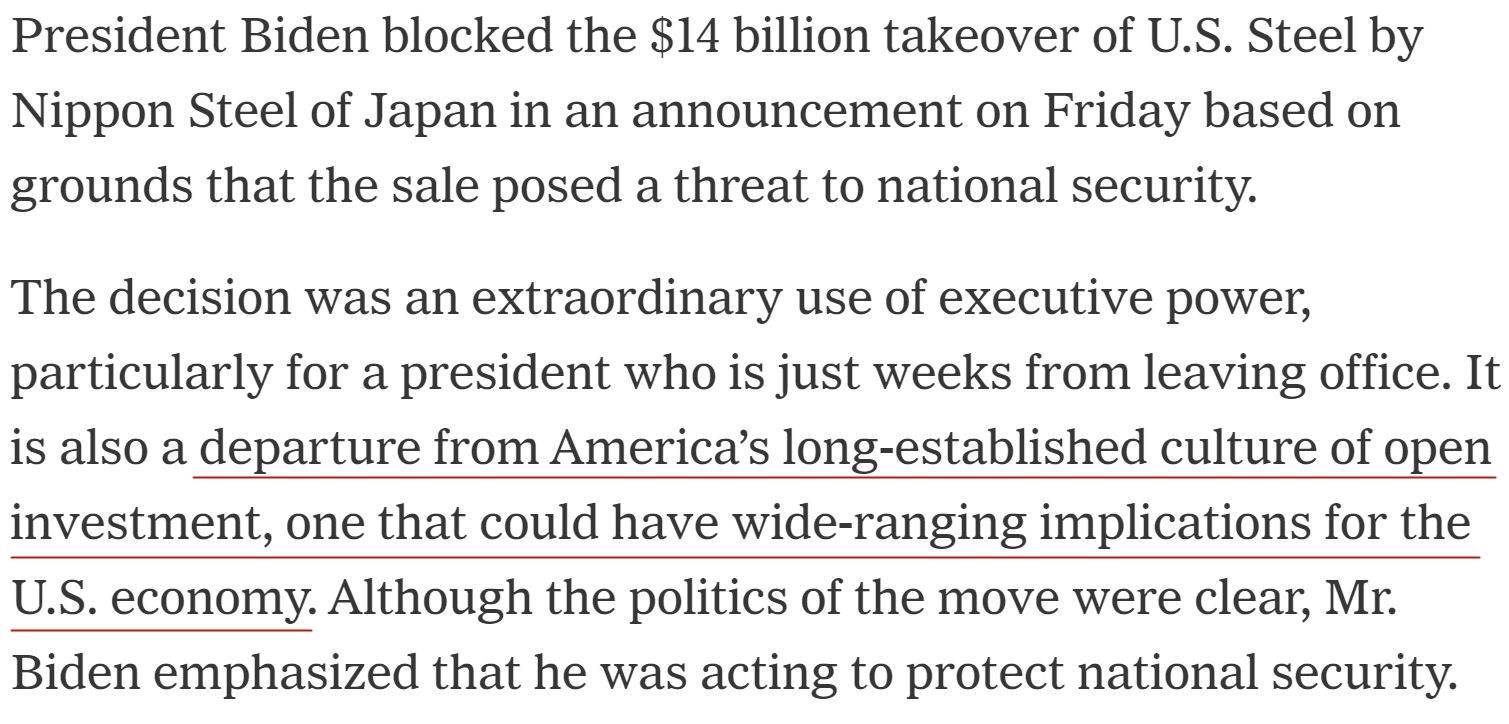 如今,日铁收购美钢受阻再次证明,美国政府滥用国家权力干预企业经营的“非市场行为”正在不断增加。