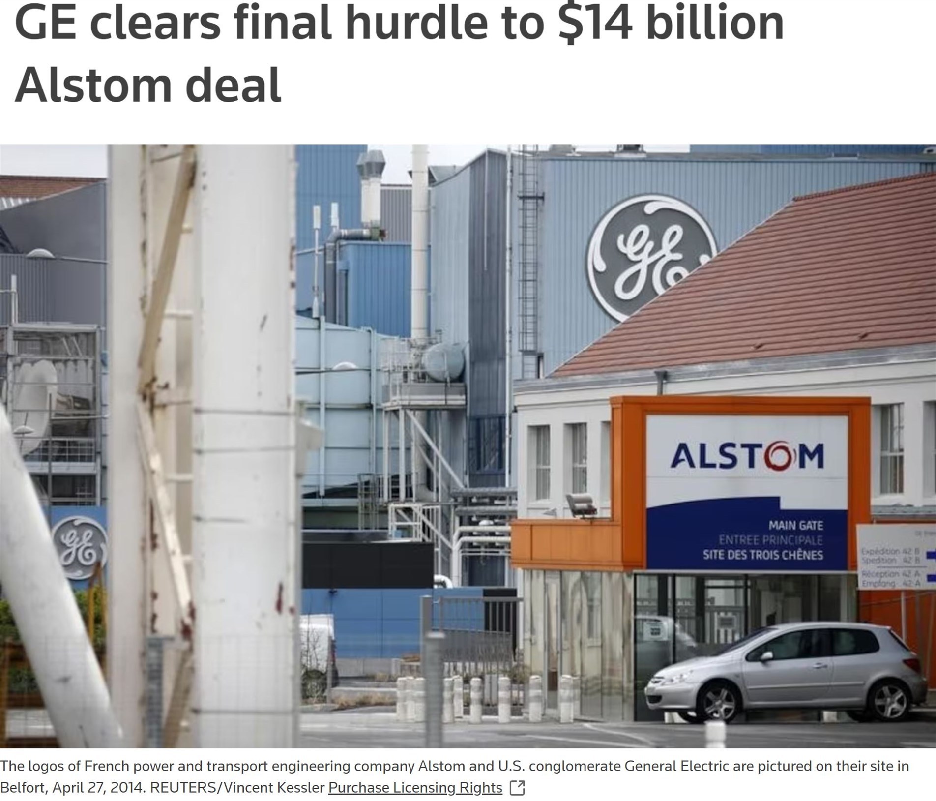 △路透社:2015年9月,美国通用电气公司扫清了以140 亿美元收购阿尔斯通电力设备业务的最后障碍。