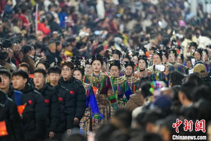 1月4日晚,2025年贵州“村超”拉拉队入场。图为“村超”球场现场。韦贵金 摄