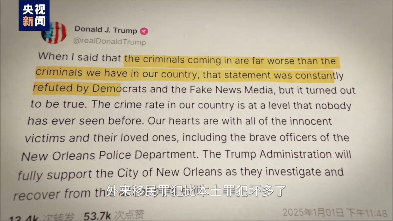 对于美国民众的安全关切,候任总统特朗普当天回应称:“事实证明外来移民罪犯比本土罪犯坏多了,民主党却不承认。”特朗普的儿子也发文称:“这是拜登给美国的分手礼――移民恐怖分子。”