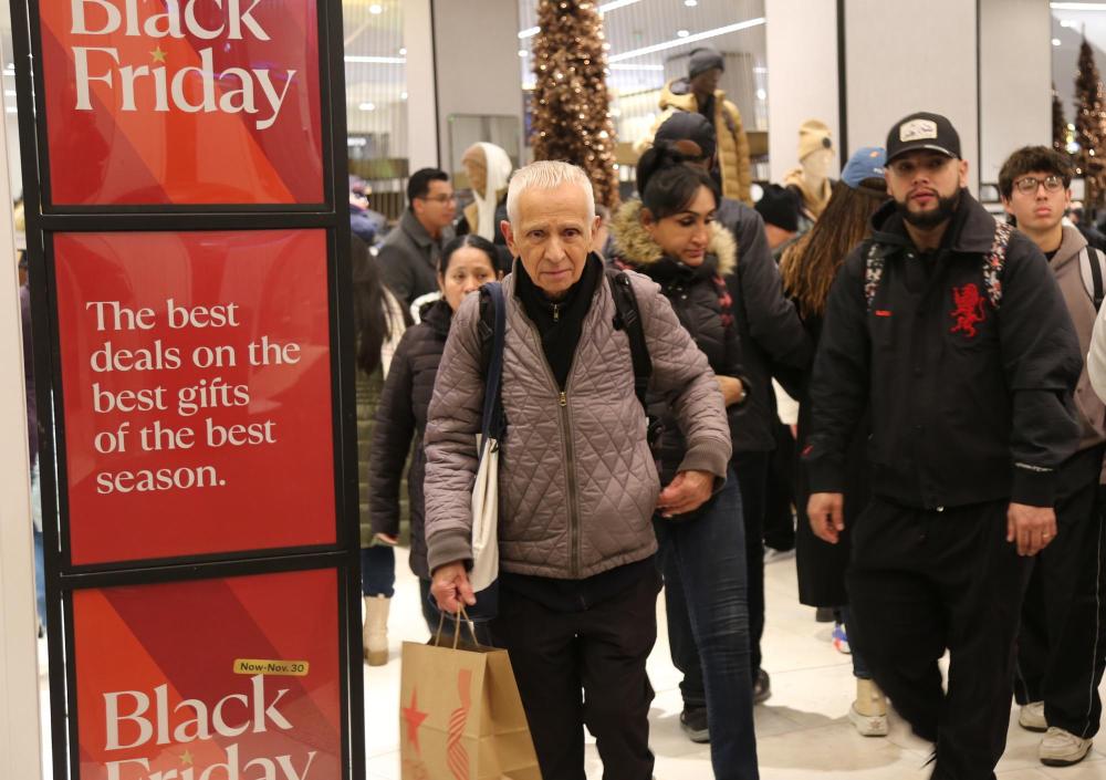 2024年11月29日,在美国纽约曼哈顿岛的一家商场内,人们经过“黑色星期五”促销广告牌。新华社记者刘亚南摄