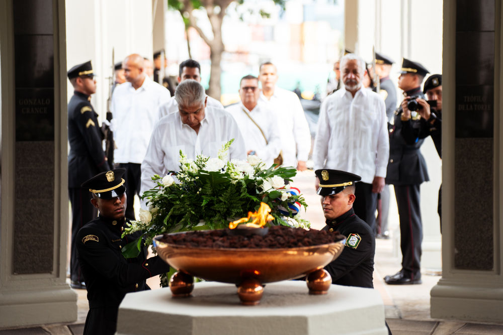 1月9日,在巴拿马首都巴拿马城,巴拿马总统穆利诺(前中)向纪念1964年“护旗运动”的“永恒之火”纪念碑献花圈。新华社记者许咏政摄