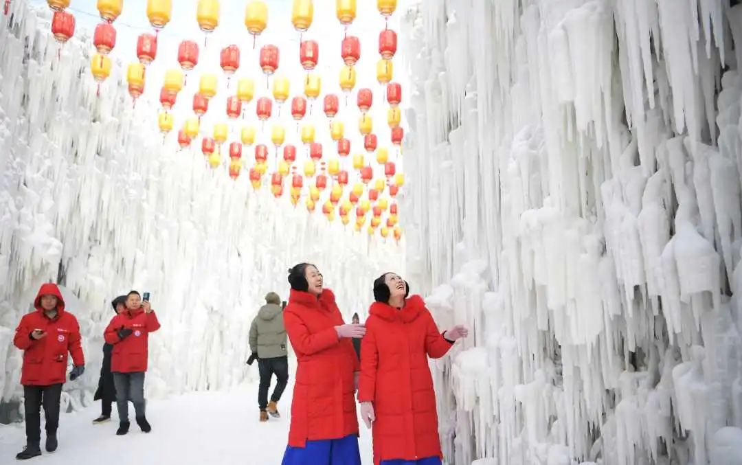 2024年12月28日,查干湖沉浸式探秘冬捕文化主题园区冰瀑景观吸引游客驻足。