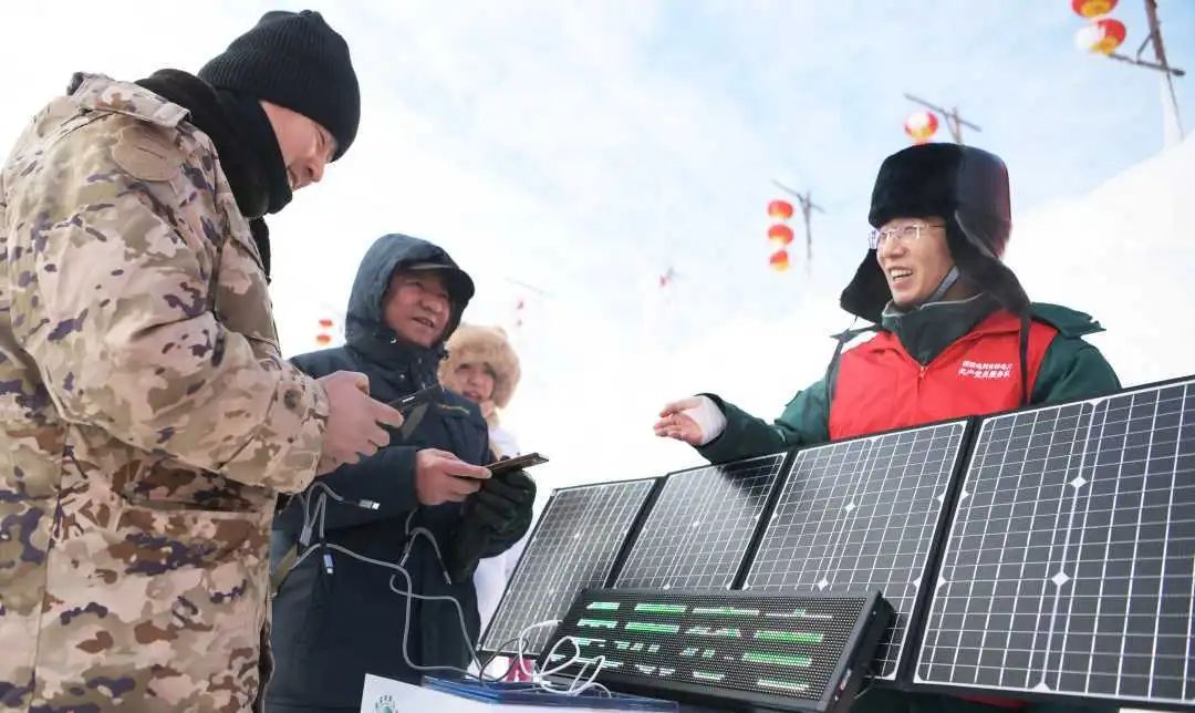 2024年12月28日,查干湖第23届冰雪渔猎文化旅游节开幕现场,国网松原供电公司员工向游客介绍“冰上可移动式手机充电桩”,帮助游客解决电子设备低温失电问题。