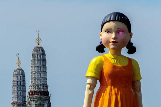 2024年12月22日,韩国Netflix系列《鱿鱼游戏2》中标志性洋娃娃“hee”出现在泰国曼谷阿伦寺前的驳船上。本文图/视觉中国