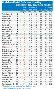 出乎意料,排在首位的是薩斯卡通,其人口增長落後於就業增長,並且是失業率低於去年的8個地區之一。