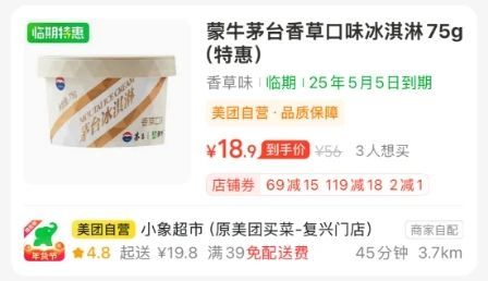 目前在外卖平台上还能买到茅台冰淇淋,其中75g的香草味口味冰淇淋只需要18.9元。不过商家特意备注道“临期特惠”――2025年5月5日到期。