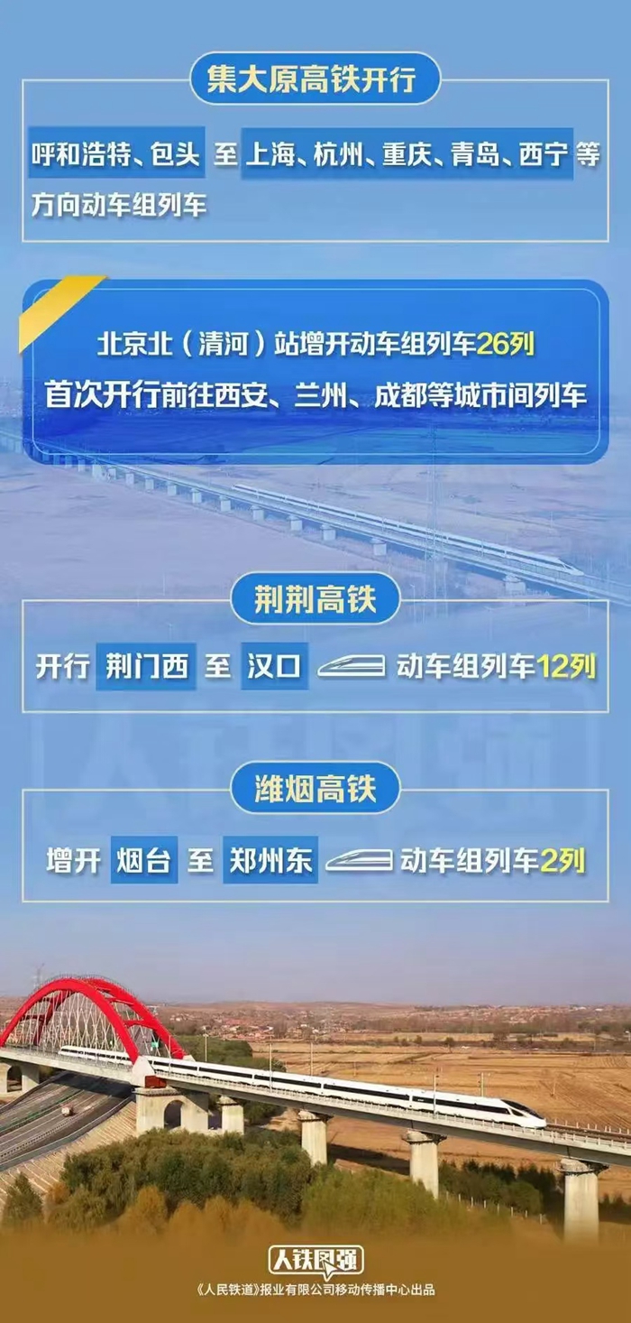 与此同时,利用潍烟高铁,增开烟台至郑州东间动车组列车2列;利用荆荆高铁,开行荆门西至汉口间动车组列车12列;利用南珠高铁南宁至玉林段,开行玉林北至南宁东间动车组列车18列等。