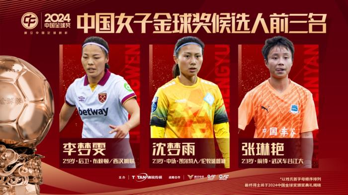 再看2024中国女子金球奖,除了张琳艳连续第三年入围奖项前三名之外,在2021年中国女子金球奖排名第二的沈梦雨,又一次回到本奖项的前三序列。目前效力于西汉姆联女足的李梦雯,凭借连年留洋的稳定发挥赢得了评委们的信任,获得“头名选票”近20张,首次进入中国女子金球奖评选前三名。