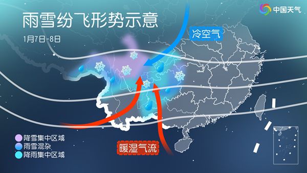 预计今起至9日,西藏东部、川西高原北部、云南西北部和东北部、贵州中北部、重庆东南部、湖北西南部、湖南西北部等地的部分地区有中到大雪,局地暴雪;降雪量普遍有3~8毫米,局地高海拔地区甚至可达10-15毫米;新增积雪深度2~6厘米,局地10厘米以上。主要降雪时段在8日夜间至9日。