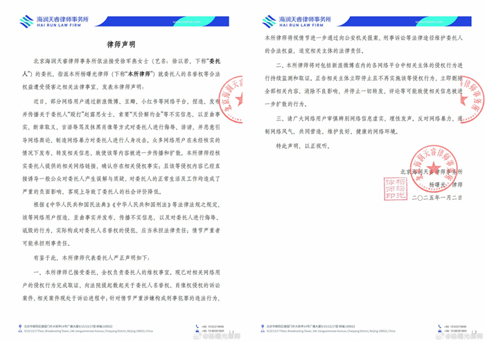 声明中还提到,律师已对相关网络用户的侵权行为完成取证,将视情节通过向公安机关报案、刑事诉讼等法律途径维护委托人的合法权益。