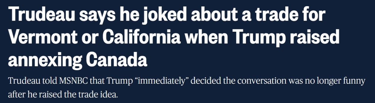 特鲁多日前在接受采访时提到,他跟特朗普建议,“也许可以用佛蒙特州或加利福尼亚州来交换(加拿大的)某些地区”,而“特朗普立刻觉得这个话题不那么有趣了”。