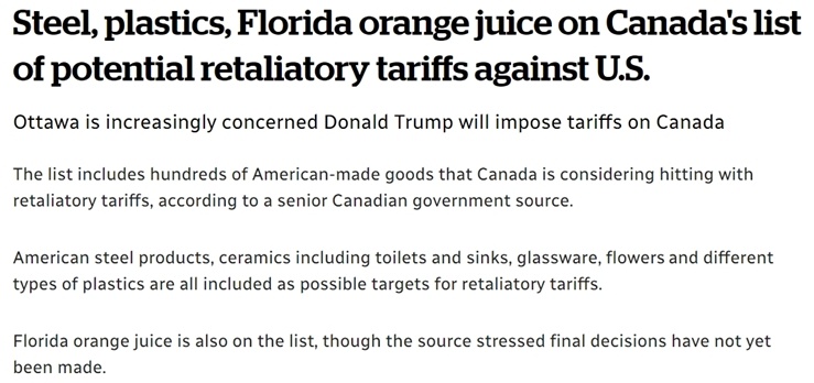 另据媒体报道,加拿大已考虑对来自美国的马桶和水槽等陶瓷制品,以及部分钢铁产品加征关税。其他可能被加征报复性关税的美国产品还包括玻璃制品、花卉、某些塑料制品以及来自佛罗里达州的橙汁。