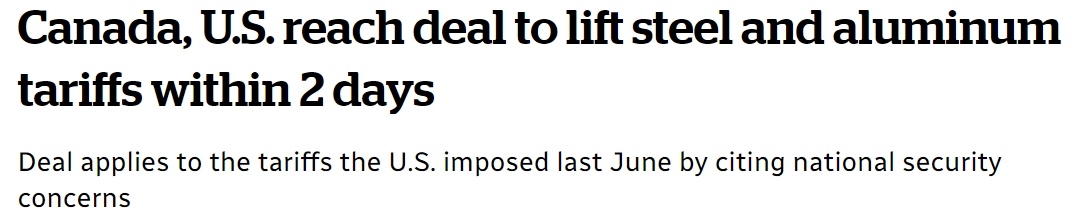 当时,加拿大便对一系列美国商品加征了等值关税,这迫使美国重新考虑其政策立场。最终,双方历经数月谈判后达成协议,美国取消针对加拿大钢铁和铝的额外关税。