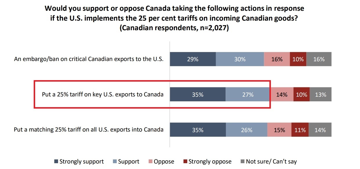加拿大民意调查机构安格斯・里德研究所的最新民调结果显示,62%的加拿大人支持采取对等贸易报复措施,也就是对进口自美国的商品征收25%的关税。