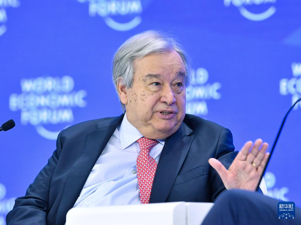1月22日,联合国秘书长古特雷斯(左)在瑞士达沃斯举办的世界经济论坛2025年年会上讲话。
