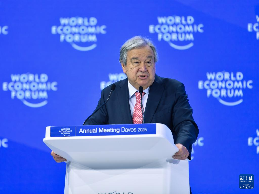 1月22日,联合国秘书长古特雷斯在瑞士达沃斯举办的世界经济论坛2025年年会上讲话。