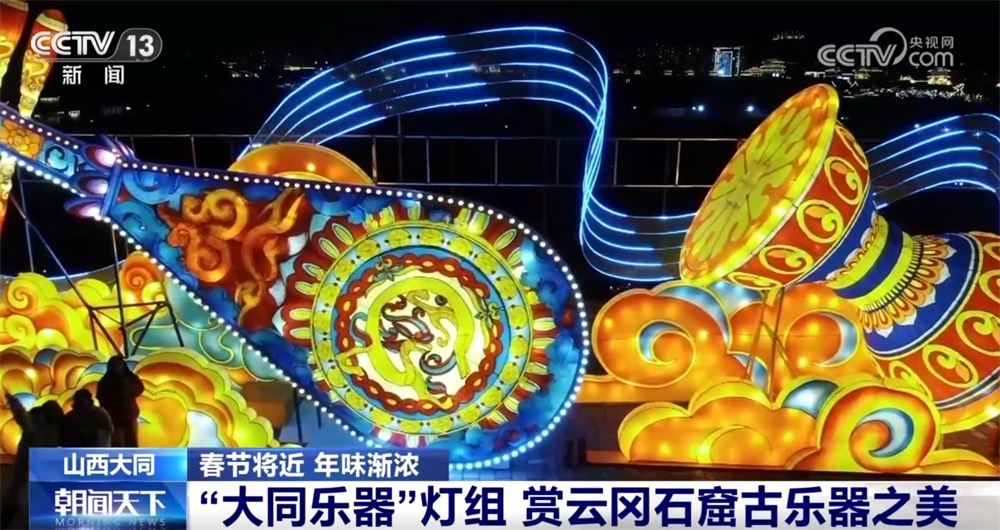 要说哪个灯组借鉴云冈石窟元素最多,就是这个名为“大同乐器”的主题灯组。它主要借鉴了云冈石窟第十二窟,也就是被人们称为“音乐窟”里面的众多元素,以琵琶、筚篥、齐鼓、竖箜篌、琴等乐器为原型来设计的。