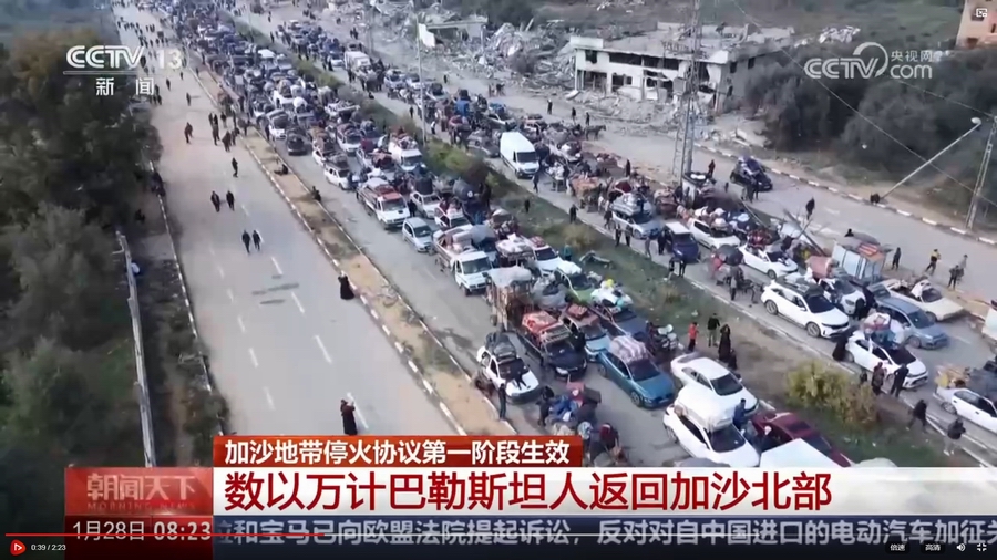 总台报道员 奥萨马・阿什:数以万计的人今天暂时结束了流离失所的日子。他们曾经被迫从加沙地带北部逃到南部避难,如今,他们可以返回自己的家园,但家园已经被破坏。没有人知道接下来的日子会怎样。