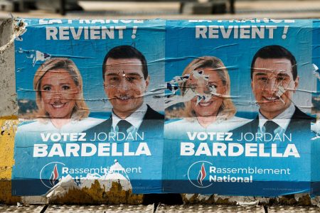 圖為2024年7月5日,勒龐領導的法國極右翼政黨國民聯盟與該黨主席巴德拉的海報 路透社