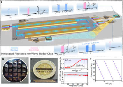 南開大學新聞網1月27日消息,近日,南開大學智能光子研究院祝寧華院士團隊與香港城市大學合作,基於兼容CMOS工藝的4英寸薄膜鈮酸鋰平台,首次設計並構建了集成薄膜鈮酸鋰光子毫米波雷達,實現了高達厘米級的距離與速度探測分辨率,同時在逆合成孔徑雷達二維成像中亦達到了厘米級的卓越分辨率,成功突破了電子雷達低頻段窄帶寬的瓶頸,大幅提升了光子雷達的分辨率和集成度,是目前分辨率最高的片上光子雷達。此研究工作以“Integrated lithium niobate photonic millimeter-wave radar”(集成薄膜鈮酸鋰光子毫米波雷達)為題發表於Nature Photonics(《自然-光子學》)上。