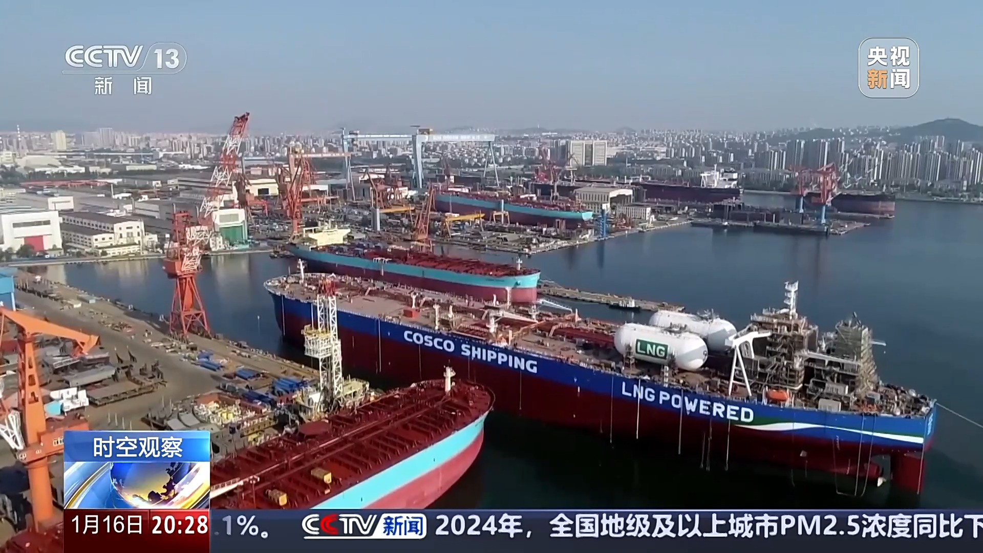 接下来,我们再来关注这份成绩单中三个亮眼数据,第一个,造船完工量占世界市场份额55.7%,这意味着2024年全球交付的船中,有一半以上是中国制造。第二个,新接订单量占世界市场份额74.1%,这意味着后续所造的船中有七成以上是中国制造。第三个,手持订单量占世界市场份额63.1%,更是创下中国造船史的最好水平。2024年,中国造船业不仅在订单数量上持续领跑,建造交付的速度和质量也在不断提高。一大批高附加值船型相继交付。