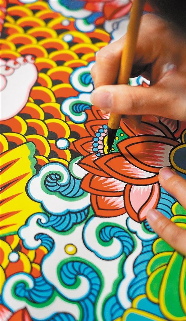 2024年12月25日,武强非遗工坊工作人员在描绘年画。
