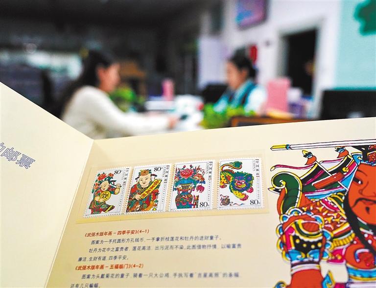2024年12月25日,在武强县一家邮政网点拍摄的武强木版年画邮票。2006年,由武强木版年画制成的带邮资特种邮票面向全国发行。