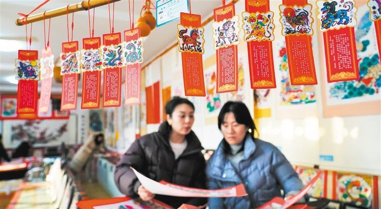 2024年12月24日,游客在武强县一家年画文创店选购。