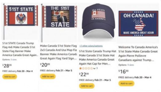 據CTV News一份報道,假如你在亞馬遜加拿大網站amazon.ca搜索欄輸入“第51州”(51st state),會發現大量看似宣傳美國吞併加拿大的商品正在出售,從“第51州”徽章,到汽車保險杆貼紙,甚至有一隻鷹覆蓋着楓葉的加拿大國旗等等。