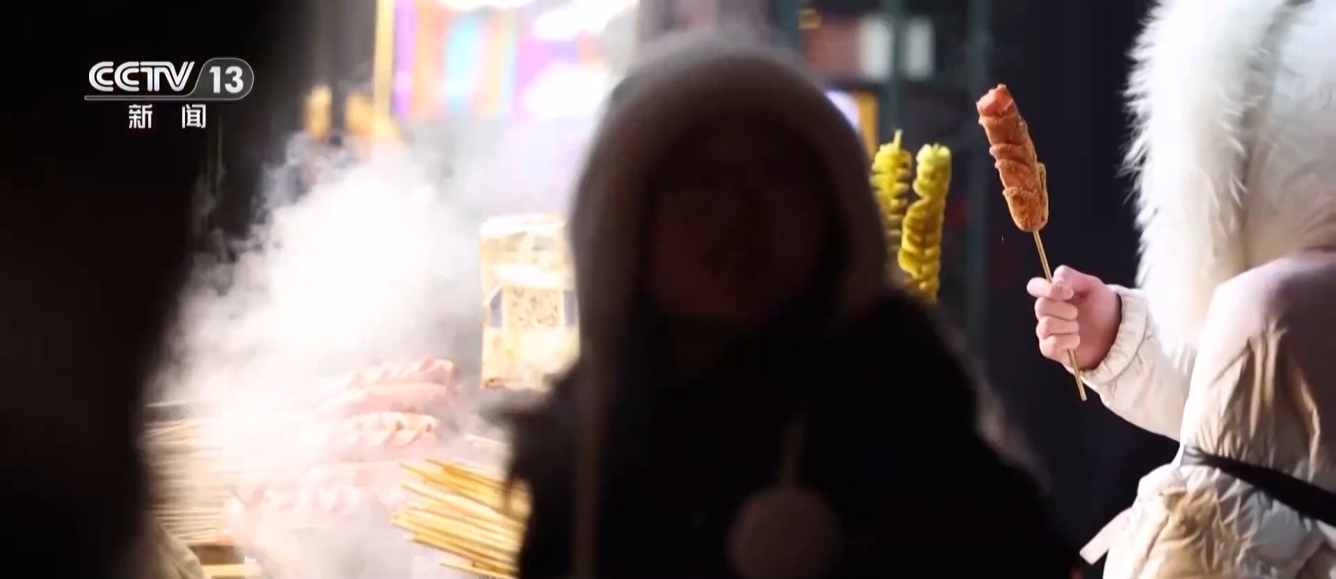 在前面不远处,还有红肠飘来的阵阵香气。红肠作为哈尔滨特色美食,有着百年历史,是游客必尝的美味。美食和冰雪旅游在这里相互交融,为哈尔滨的夜晚增添了别样的烟火气。