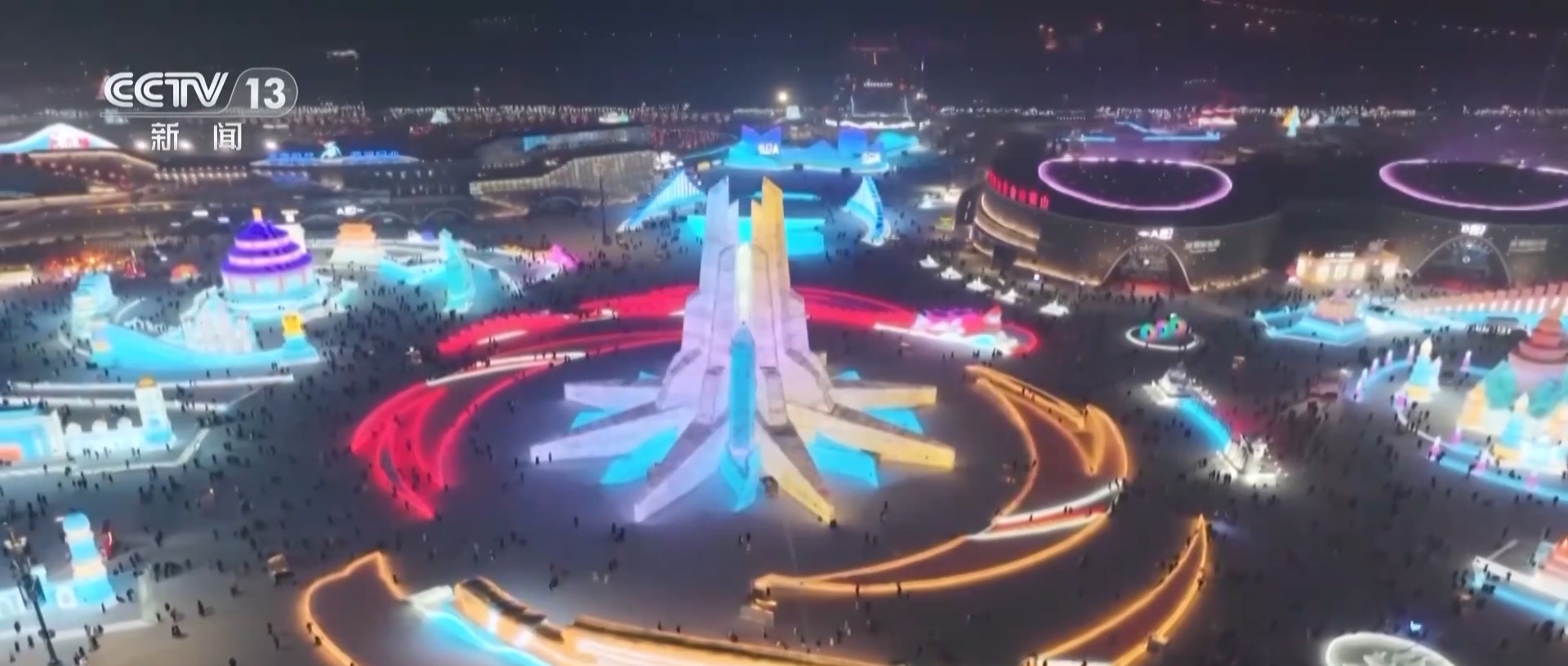 哈尔滨的中央大街上,整条街道被绚丽的灯光装点。“约会哈尔滨,冰雪暖世界”是哈尔滨今年冰雪季的主题,它向全世界发出邀请,来到哈尔滨感受冰雪的魅力。