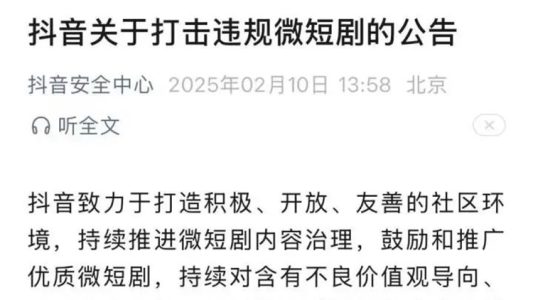 2月10日,抖音、快手及微信官方分別發布違規微短劇治理公告。