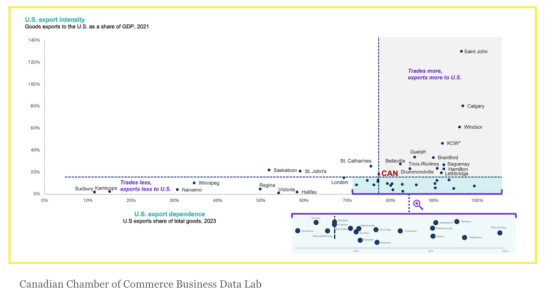 加拿大商會的商業數據實驗室(BDL)隨後發布了一份報告,分析加拿大哪些城市將受到這些關稅的最嚴重打擊。