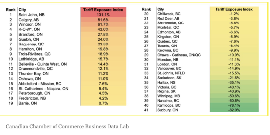 BDL解釋道:“更遠的‘東北’城市(如聖約翰、卡爾加里和溫莎)可能會受到美國關稅的更嚴重打擊。”BDL還將加拿大41個城市根據受美國關稅影響的程度從大到小進行了排名。
