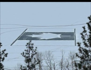 這面美麗的白雪國旗長 320 英尺,高 120 英尺,從附近基隆拿國際機場起飛和降落的飛機上都可以看到。薩頓說,他精心繪製了尺寸圖,用麻繩纏繞冰刺,在湖面上勾勒出輪廓。