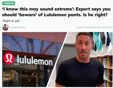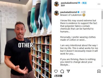在視頻中,他稱Lululemon以及許多其他品牌的瑜伽褲襠部都含有“永久化學物”(PFAS),可能對健康造成潛在威脅。