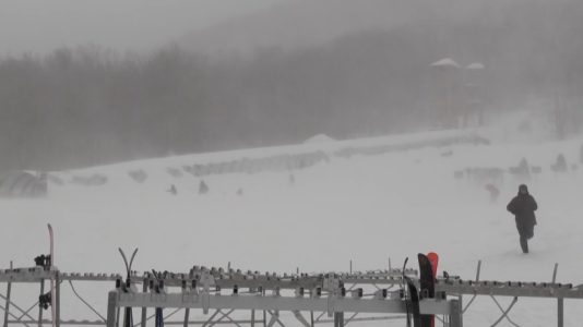 在Mont Orford,滑雪者勇敢地面對道路和寒風,享受新鮮的雪。
