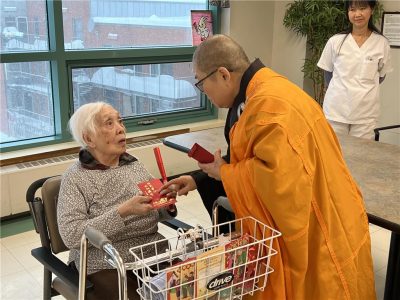 【時報訊】滿地可2月16日正迎第二場大雪暴,12位佛光人仍如期前往中華醫院探訪長者,在佛光山滿地可華嚴寺如廣法師帶領下,為院內長者送上誠摯的新春祝福,恭誦〈藥師灌頂真言〉,以佛光四句地送上誠摯的新春祝福,恭誦〈祥師灌頂真言〉,以佛里士光四句樂句給喜吉。如廣法師並親手贈送紅包及佛光山開山祖師星雲大師春聯墨寶,讓長者們在嚴冬之中,感受到濃濃的溫暖與關懷。