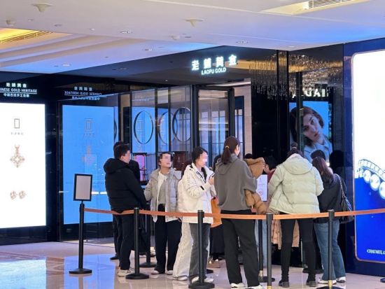 2月21日晚七点半,老铺黄金国贸商城店门口挤满了排队的顾客。图/于盛梅 摄
