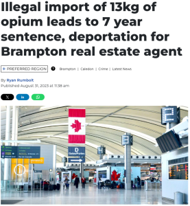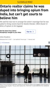 多倫多地區一名房地產經紀人從印度返回後,在多倫多皮爾遜機場被抓了,他說被一位家庭朋友欺騙了,托他將一包印度糖果帶回加拿大,結果海關查獲是鴉片。
