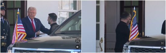會談前,特朗普迎接(左)。會談後,澤連斯基“黑臉”離開。(右)